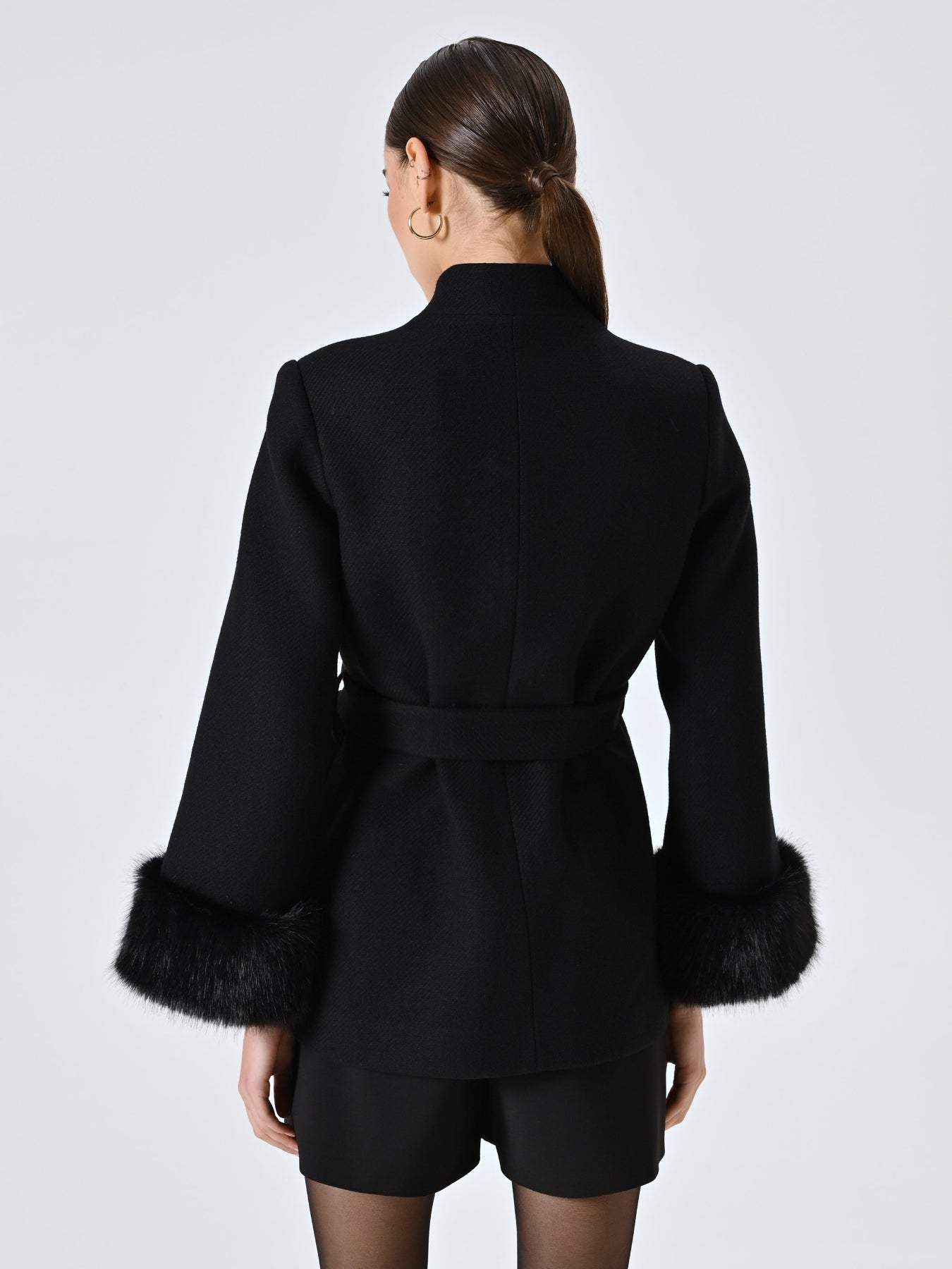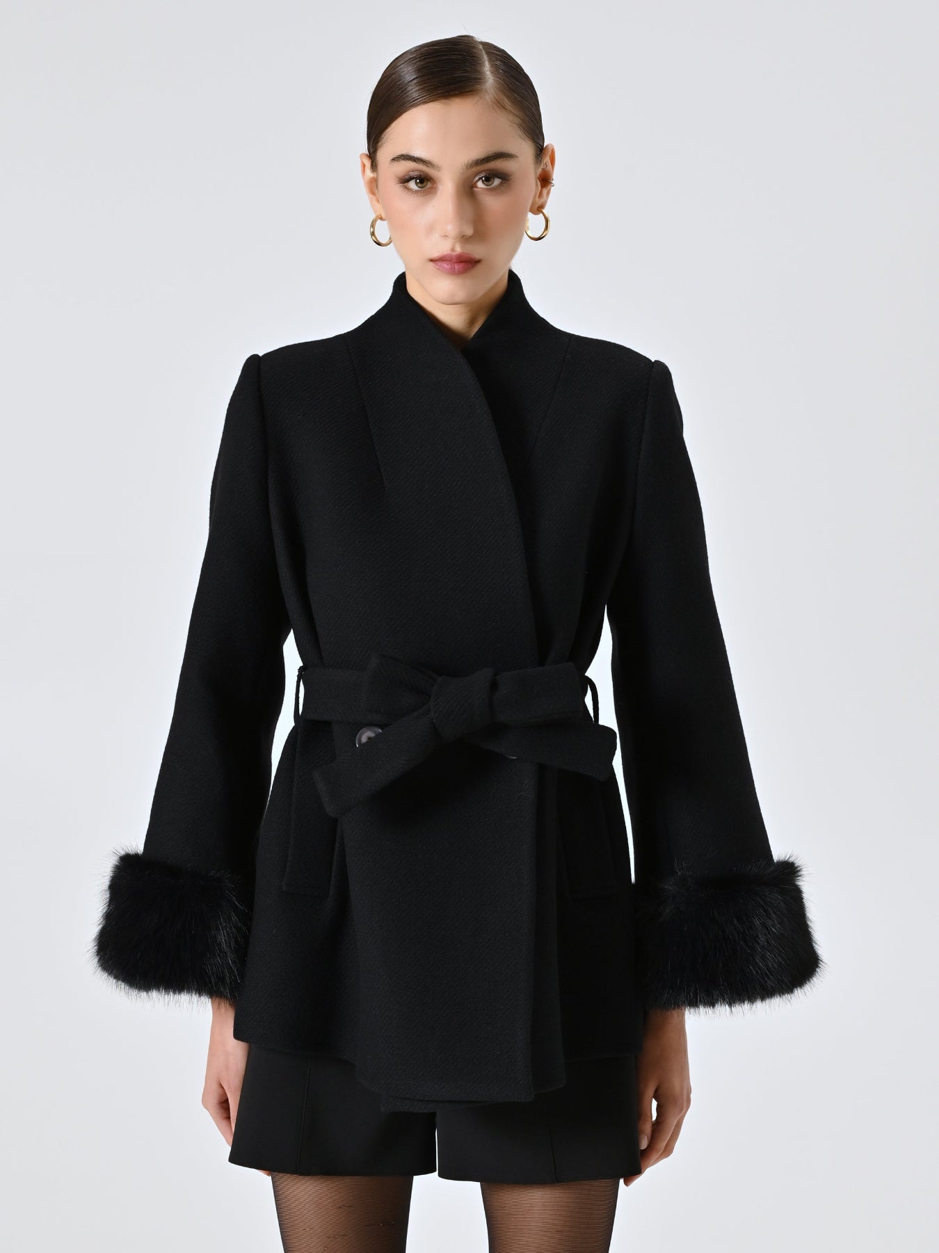 Το Κοντό Παλτό λεπτομέρειες Γούνας είναι ένα εκλεπτυσμένο πανωφόρι που προσθέτει μια πινελιά γοητείας στις χειμερινές σας εμφανίσεις, συνδυάζοντας άνεση και φινέτσα.