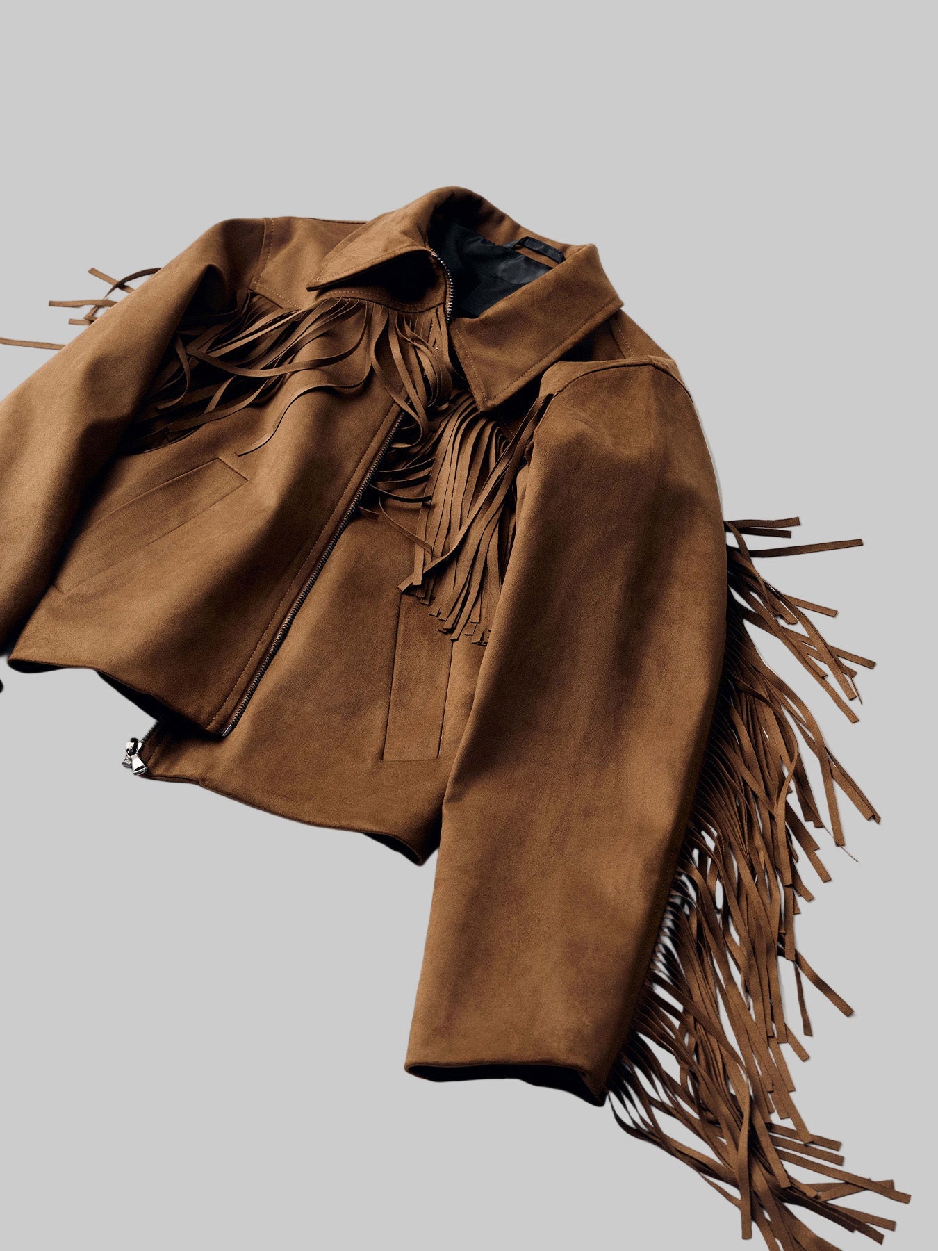 Μπουφάν με κλασικό γιακά και κρόσσια στος στήθος και στα μανίκια.
