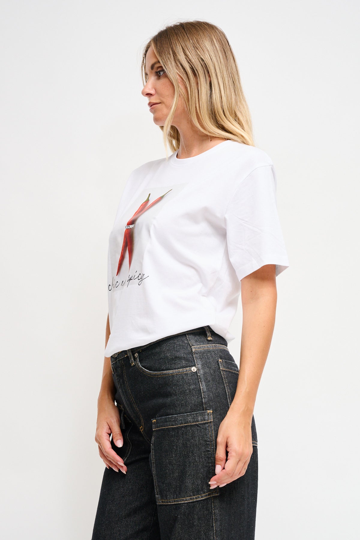 Βαμβακερή μπλούζα με κοντά μανίκια και τύπωμα Chilli Peper. Κανονική εφαρμογή. To μοντέλο είναι 1,74 και φοράει μέγεθος small.