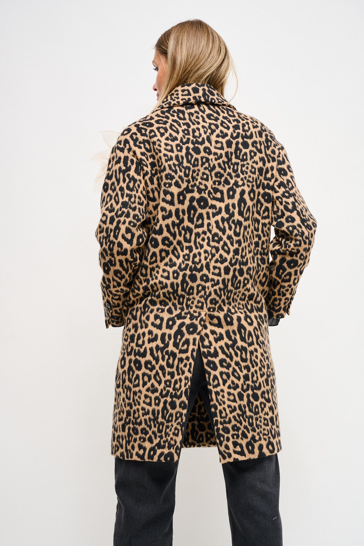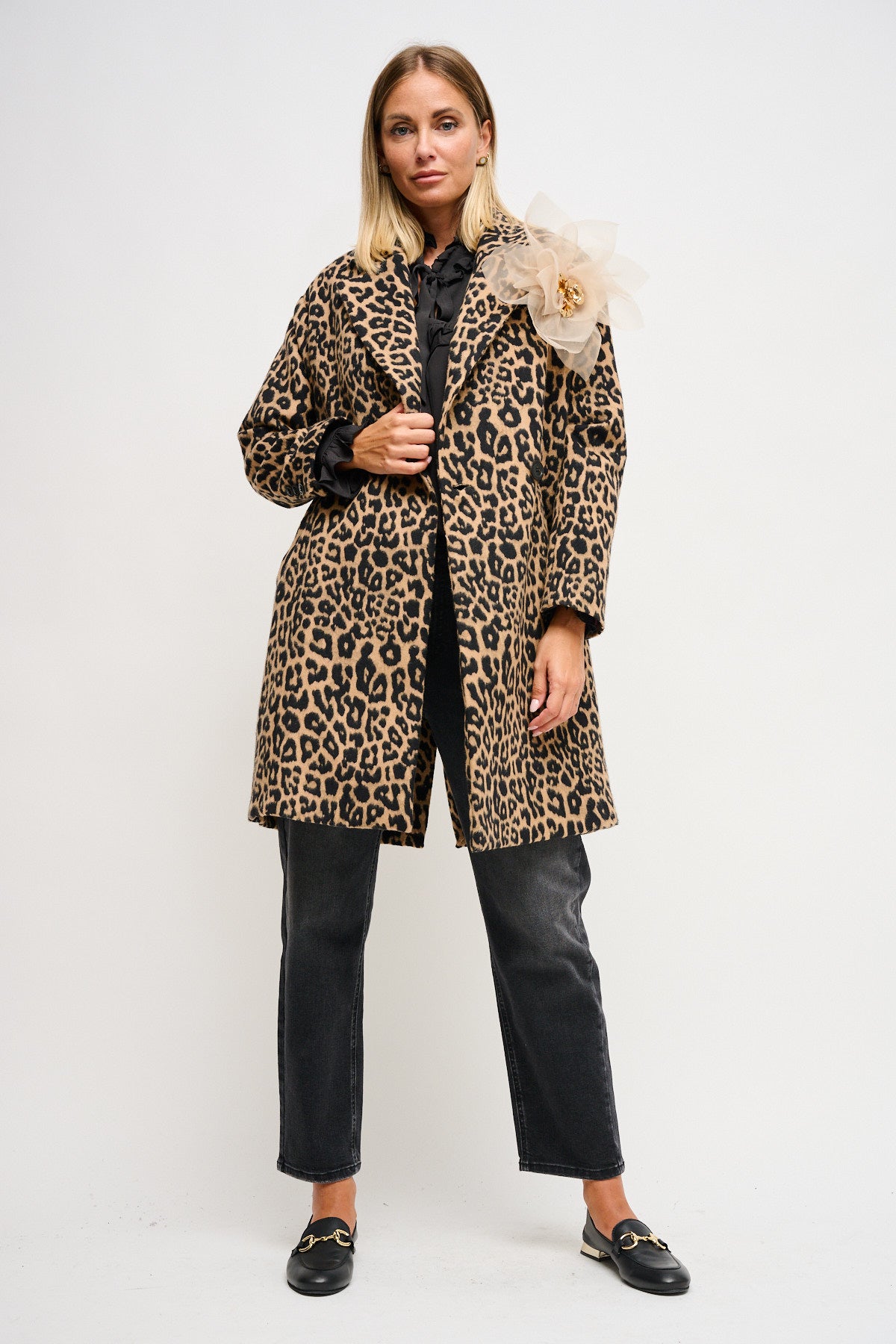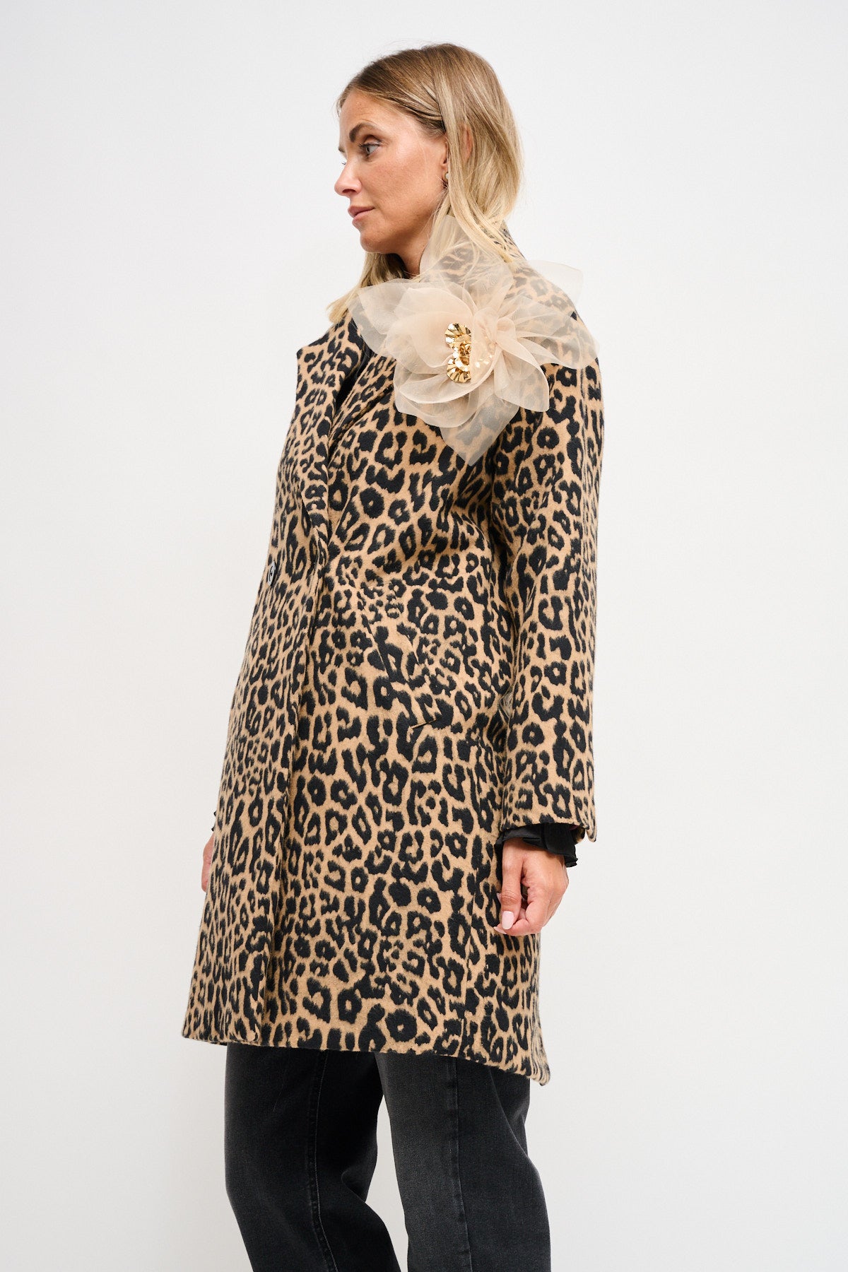Ημίπαλτο με σταυρωτό κούμπωμα,λεοπάρ πριντ και αποσπώμενη καρφίτσα λουλούδι.