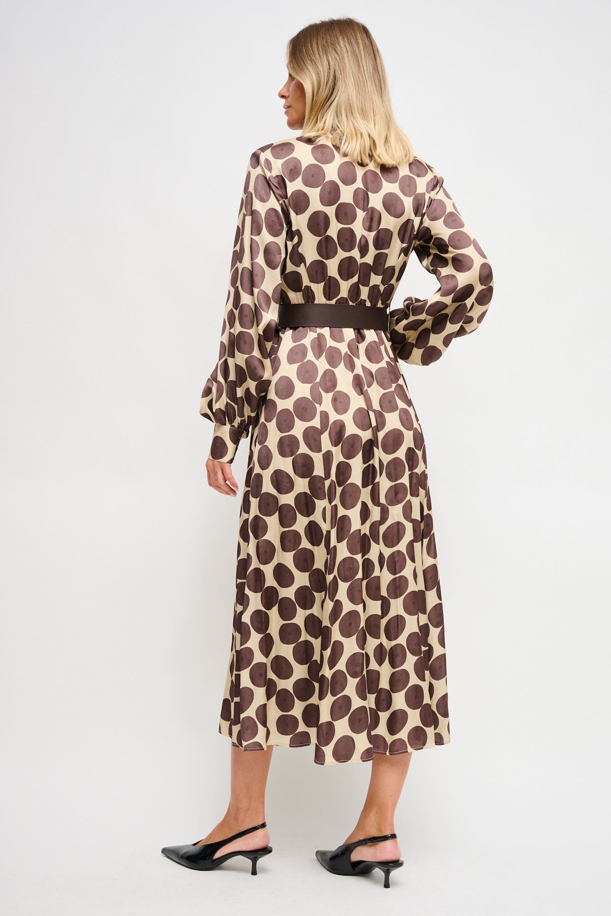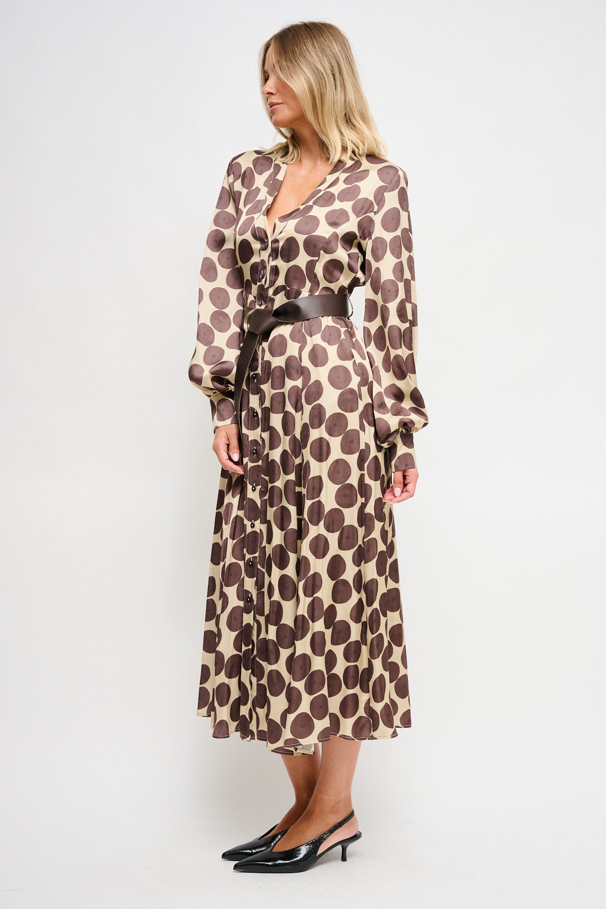 Μακρύ φόρεμα με καφέ μεγάλα πουά,μακριά μανίκια και ζώνη στην μέση,κλείνει εμπρός με κουμπιά.