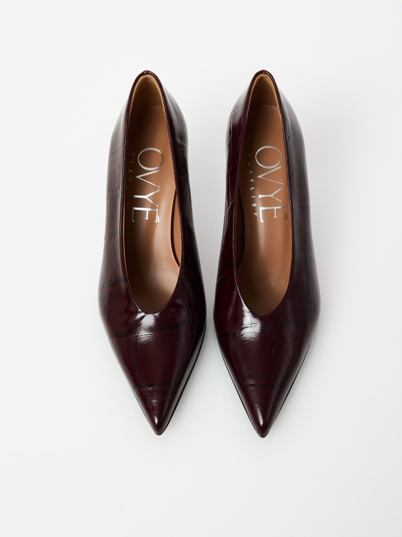 Γόβες σε κομψή μπορντό απόχρωση από τη συλλογή Ovye, σχεδιασμένες για να συνδυάζουν διαχρονική φινέτσα και άνεση. Κατασκευασμένες εξ ολοκλήρου από δέρμα (εξωτερικό, επένδυση και εσωτερική σόλα).